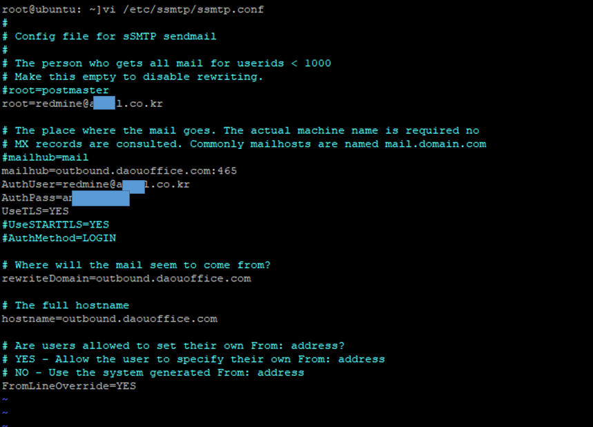 설정 파일의 위치는 /etc/ssmtp/ssmtp.conf 에 있습니다.
