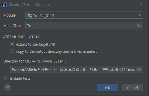 코드상의 Main 클래스가 있는 것 선택해 주고 JAR files from libraries에서 extract to the target JAR 선택 후 OK