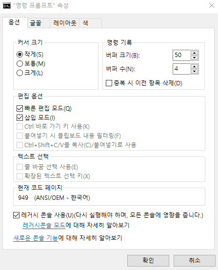 명령 프롬프트 속성에서 하단의 레거시 콘솔 사용 체크 박스를 해제하고 확인을 누른다.