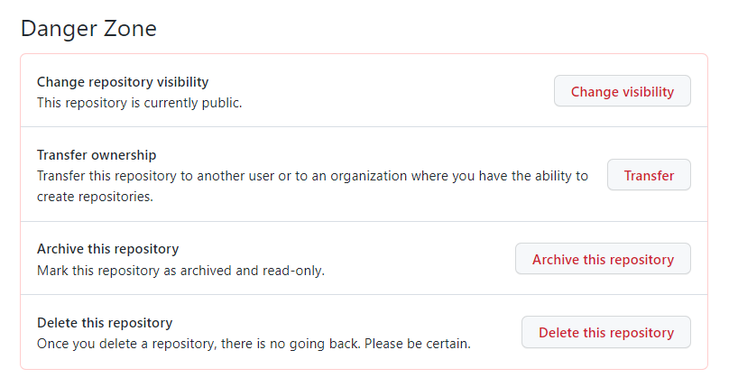 스크롤 해서 하단 Danger Zone 중 Delete this repository 선택
