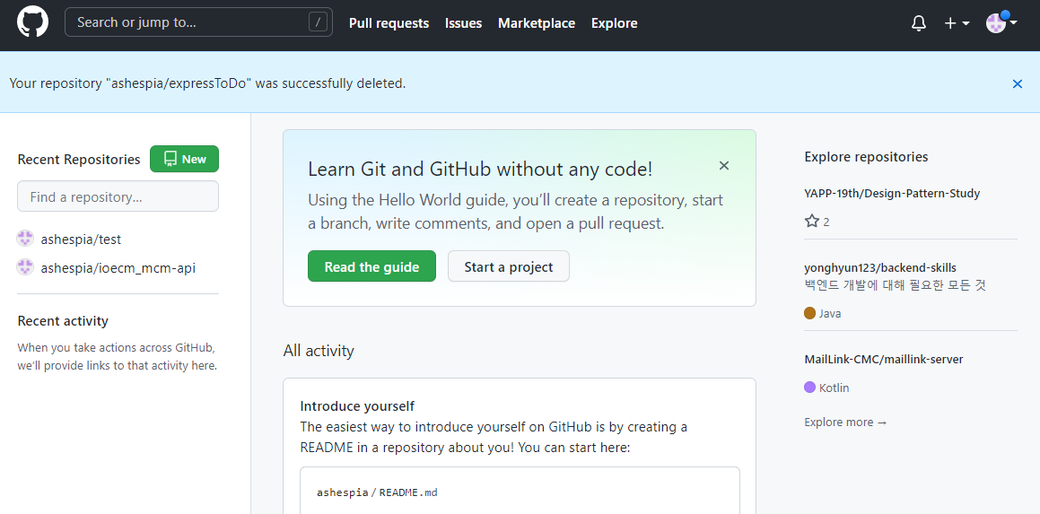 그리고 상단 바에 Your repository "ashespia/expressToDo" was successfully deleted. 라는 내용이 표시된다.