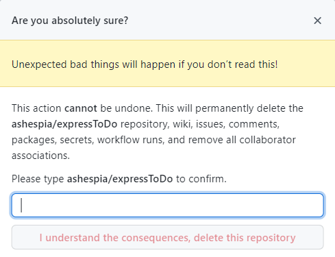 삭제하려고 하는 리포지토리 이름인 ashespia/expressToDo 를 복사해서 입력한다.