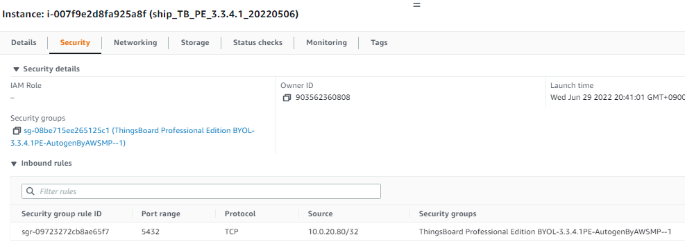EC2 AMI 이미지로 최초에 Thingsboard를 생성시에 기본 security group에는 PostgreRDS 기본 포트인 5432포트 가 존재 하지 않는다.