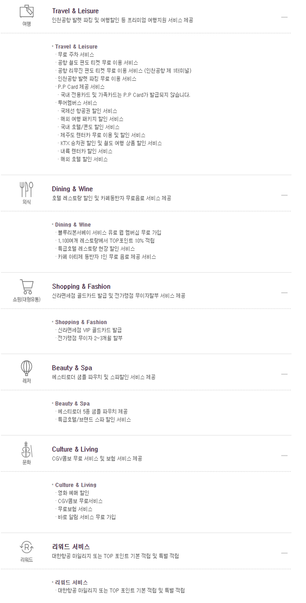 • Travel & Leisure (국내선 동반자 1인 왕복 무료 항공권 or 골프라운지 챔피온 멤버십 무료 이용)
